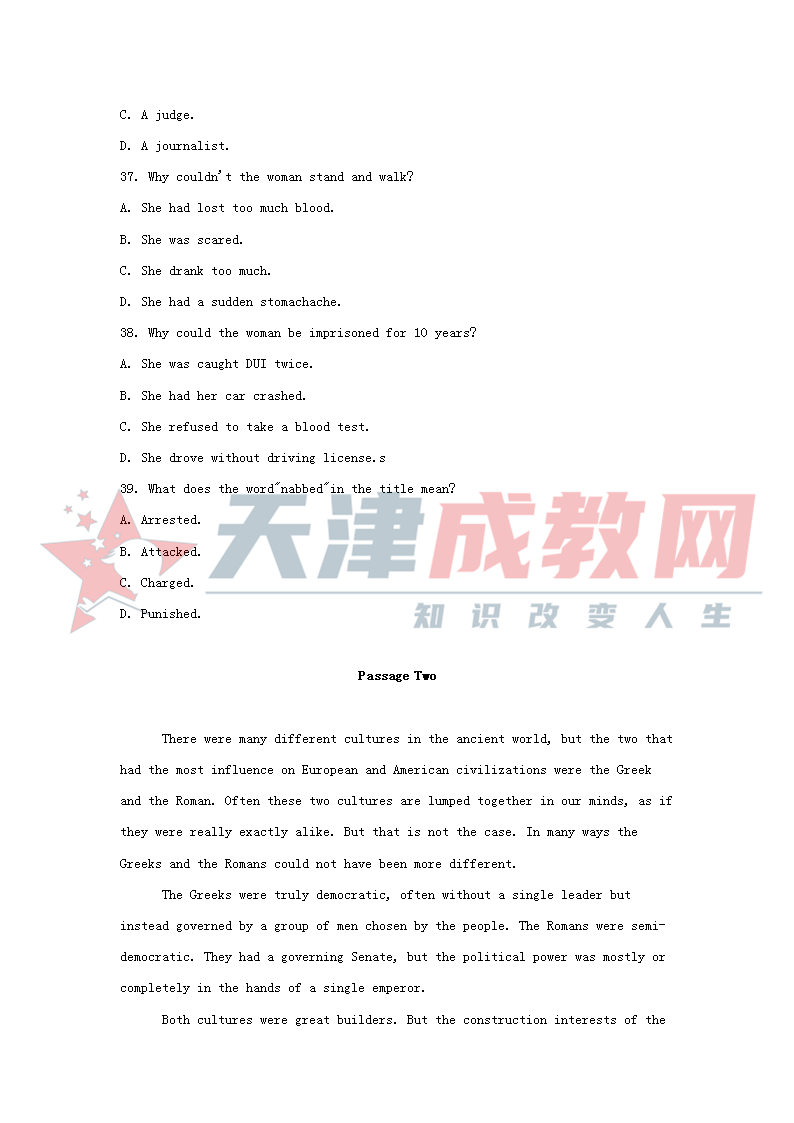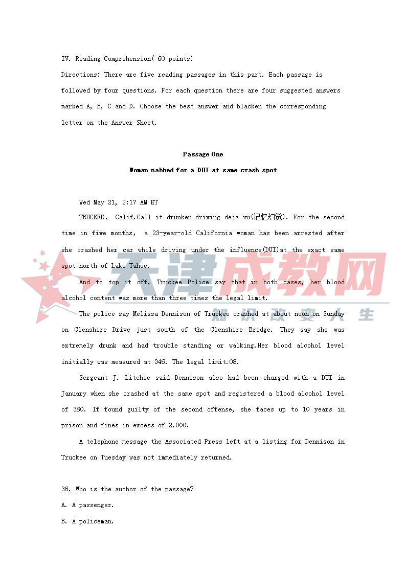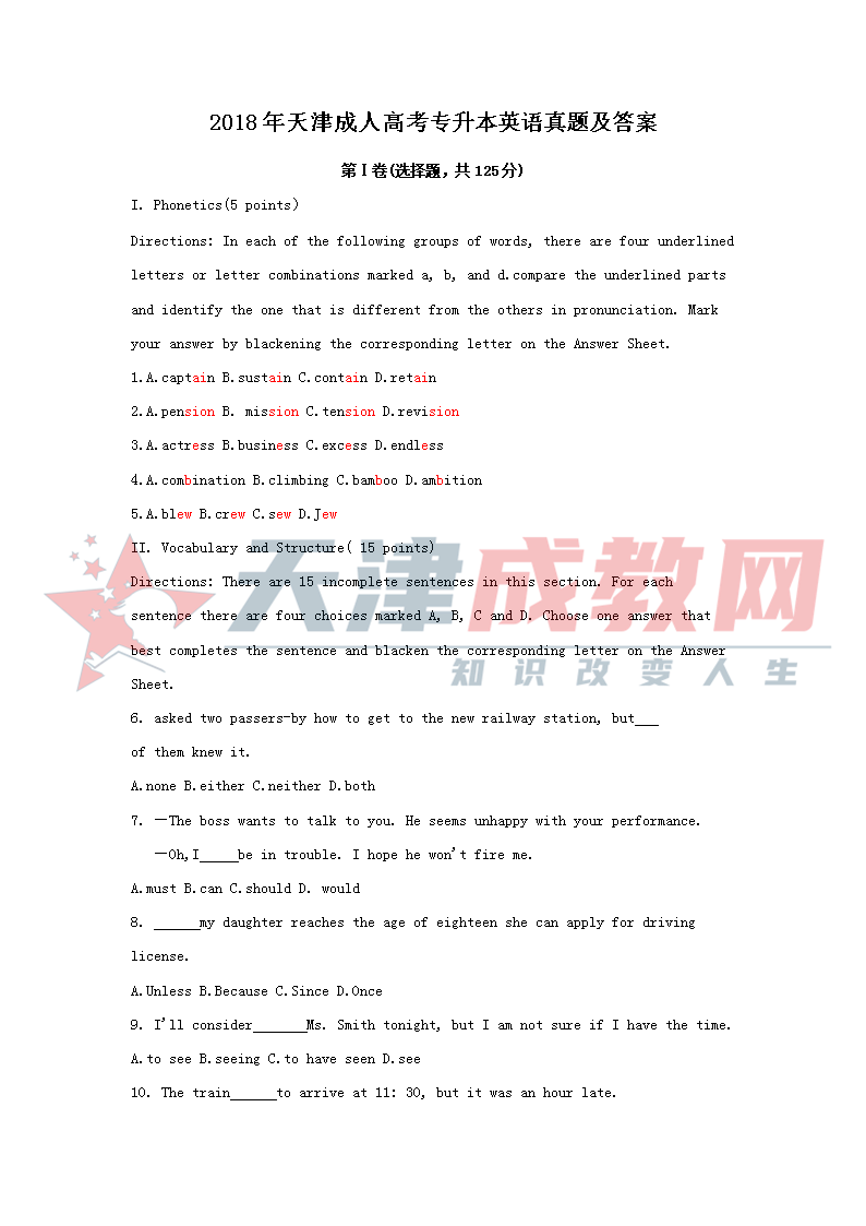 2018年天津市成人高考报名后入学考试本科英语真题和答案,需要的考生可点击原图下载复习。天津成考报名地址:天津市南开区卫津路92号天津大学院内 联系电话022-23682110节假日手机15002287077 学业咨询QQ或微信2511211128